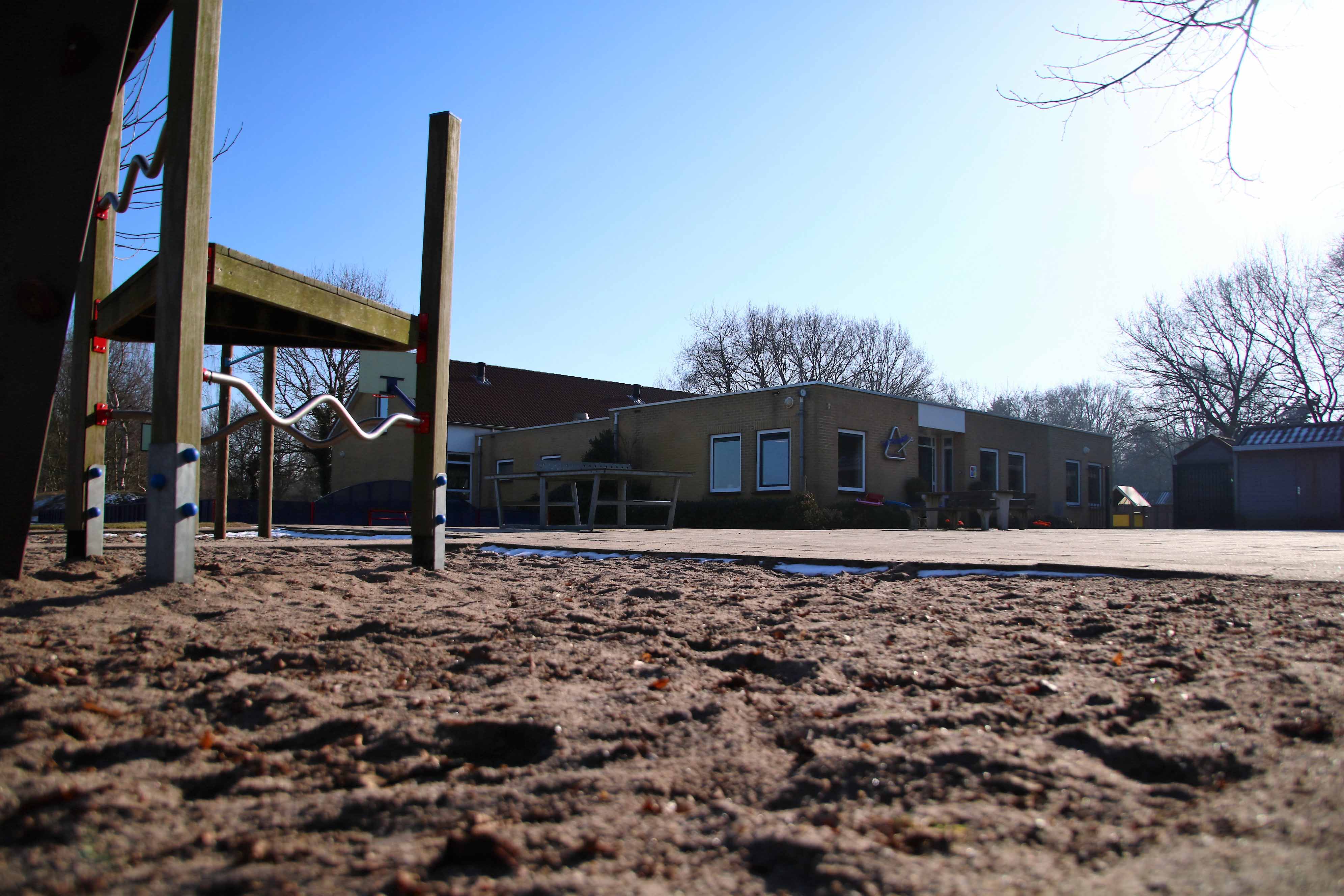 grote speelplein en speelveld onder toezicht van een vaste overblijfouder.